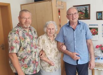 Am 05.07.2025 feierte Frau Elfriede Bodenstein (Mitte mit Sohn) ihren 95. Geburtstag. Der Beigeordente Burkhard Knittel (links) gratulierte im Namen der Stadt Hildburghausen.
