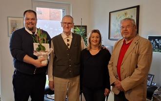 Zu seinem 90. Geburtstag am 03. August 2025 gratulierten Herrn Rolf Schlott 2.v.l.) der Beigeordnete der Stadt Hildburghausen Burkhard Knittel (rechts) sowie der 2. Beigeordnete des Landkreises Hidburghausen, David Wiedemann (links).