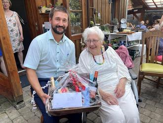 Bei strahlendem Sonnenschein gratulierte der Bürgermeister Patrick Hammerschmidt der Jubilarin Frau Tomczak zu ihrem 90. Geburtstag.
