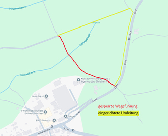 Eine Umleitungsstrecke wurde eingerichtet. So können Sie nun an der alten Linde (statt nach rechts) geradeaus wandern, bis zum Straßenparkplatz an der L342 und dort nach rechts den Pfad an der Hauptstraße nehmen. Dort erreichen Sie nach etwa 500 Metern die Überquerung der L342 und wandern ab dort wieder auf der ausgewiesenen Route.