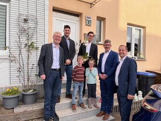 v.l.n.r.: Ortsvorsteher Sascha Hoen, Wirtschaftsförderer Christopher Klein, Lucas Willberger, Steve Willberger (Inhaber), Sophia Willberger, Bürgermeister Markus Weber, Teamleiter Silvio Rehpenning