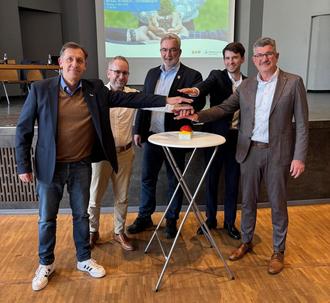 (v.l.n.r.) Jörg Wilhelmy (Bürgermeister Gde. Ensdorf), Carsten Leinenbach (Komm. Wärmeplaner der drei Gemeinden), Stefan Louis (Bürgermeister Gde. Bous), Dr. Florian Nigbur (TÜV Rheinland Consulting GmbH), Markus Weber (Bürgermeister Gde. Schwalbach)