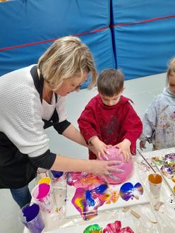 Am Freitag, den 10.03.23 besuchte uns dann die Dozentin Mariola Konkol von der Malschule Schwalbach. Bepackt mit großer Abdeckfolie, Leinwänden, Luftballons und jede Menge Acrylfarben wurde sie von den „Malmäusen“ begrüßt. Super aufgeregt und gespannt lauschten sie den Anweisungen von Mariola und erfuhren, dass es eine Acrylic- Pouring- Technik werden wird. Dabei werden verschiedene Acrylfarben miteinander vermischt und auf die Leinwand gebracht. Dabei geht man nicht mit einem Pinsel vor, sondern arbeitet mit einer größeren Farbmasse direkt auf der Leinwand. Man lässt die Farben fließen - in verschiedene Richtungen und ineinander.