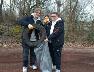 Schüler Berufsfachschule und der Berufsschule sammeln fleißig Müll
