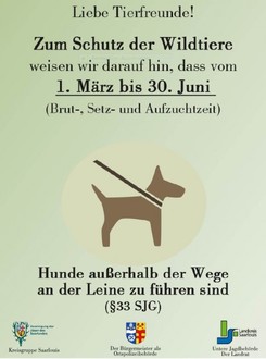Nach den Bestimmungen des Saarländischen Jagdgesetzes müssen Hunde während der Brut-, Setz- und Aufzuchtzeiten (1. März bis 30. Juni) außerhalb eingefriedeter Flächen (die sie nicht verlassen können) angeleint werden. Ausgenommen hiervon sind nur Hirten-, Jagd-, Blinden-, Rettungs-, Suchhunde und Hunde von Diensthunde haltenden Behörden, die sich im Einsatz oder in Ausbildung befinden und entsprechend gekennzeichnet sind.