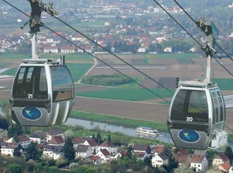 Am Anleger in Ensdorf, direkt gegenüber der Lisdorfer Au, besteht dann zum anderen die Möglichkeit des Umstiegs in eine Doppel-Gondel, um bequem zum Saarpolygon zu gelangen. Bürgermeister Jörg Wilhelmy ist es gelungen, diese Gondeln zu erwerben, da aufgrund des Klimawandels der Skitourismus in den bayrischen Skigebieten stark rückläufig ist. Finanziert wird die Maßnahme weitgehend aus dem Länderfinanzausgleich. Die Landesregierung initiierte ein Förderprogramm - ZzLuM - Zurück zu Lederhose und Milchkanne - Unterstützung der alpenländlichen Gebiete im Freistaat Bayern. Konkret gehen je Fahrtteilnehmer 2,50 € nach Bayern. Einwohnerinnen und Einwohner von Schwousdorf genießen freie Fahrt.