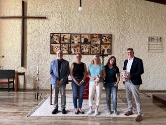 v.r.n.l.: Bürgermeister Markus Weber, Luisa Balzert (Vors. Akkordeonorchester Elm), Heike Hiery (Vors. Akkordeonorchester Ensdorf), Jenny Groh-Ney (Elterninitiative krebskranker Kinder im Saarland e.V.), Pfarrer Reinhard Janich