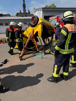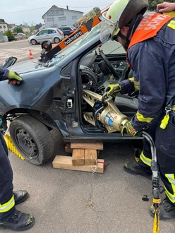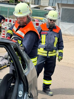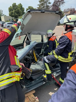 Nach einer kurzen Mittagspause ging es an die Praxis. Hier wurde an drei unterschiedlichen Unfallszenarios eine patientenorientierte Rettung aus einem PKW geübt. Bei dieser Ausbildungseinheit zeigte sich erneut die Wichtigkeit der Zusammenarbeit der drei Löschbezirke der FW Schwalbach.