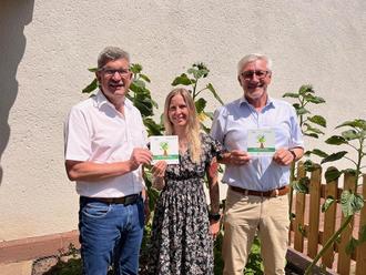 Naturbotschafter Joachim Wolfrum (r.) zusammen mit der Kitaleiterin Tatjana Lang (M.) und Bürgermeister Mar-kus Weber bei der Übergabe der Auszeichnung „Mehr Natur in Kitas“