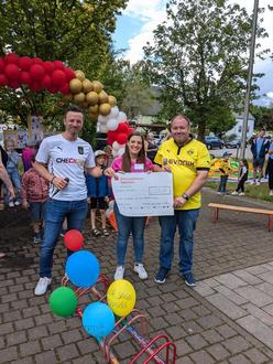 Bevor es dann zum gemütlichen Teil überging durften der erste Vorsitzende des Fördervereins, Christian Esser, und Kassierer Holger Schmaltz einen symbolischen Scheck über 2.200 EUR an die Leiterin der Kita, Kathleen Seger, überreichen. Hiermit wurden unter anderem das Außengelände der Kita neu gestaltet und eine Garage angeschafft.