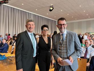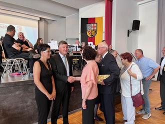 Besonderen Dank sage ich der einladenden Ersten Beigeordneten Alexandra Heinen, für Ihre Begrüßung und auch für Ihre Tätigkeit als Gemeindewahlleiterin der zurückliegenden Wahlen. Da sie als Erste Beigeordnete als Ehrenbeamtin noch bis zu den Neuwahlen des Gemeinderates nach den Sommerferien im Amt verbleibt (und mich dabei vertritt), freue ich mich natürlich auch auf die anstehende Zusammenarbeit und bringe meinen Dank mit einem Blumengeschenk zum Ausdruck.