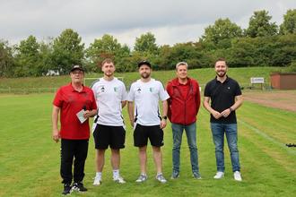 Übergabe 1. Platz SV Hülzweiler: v.l.n.r.: Hans Schneider (Geschäftsführer TPL Fachreinigung), Joshua Rupp (FC 08 Elm), Cedric Aita (FC 08 Elm), Jürgen Schmitt (Vorsitzender SVH), Erster Beigeordneter David Maaß