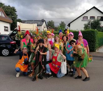 Der Kirwen-Samstag begann sehr ungemütlich, aber dann, am Spätnachmittag verzogen sich die Regenwolken und die Sonne begleitete uns am diesjährigen Kirmesumzug. In diesem Jahr nahmen wir am Umzug mit dem Motto „Zauberwald“ teil. Unser geschmückter Wagen wurde von Elfen, Zwergen und Jägern begleitetet, die mit Musik und guter Laune „uuus“er Kirw und „uuus“erm Johannes einen tollen Empfang bereiteten.