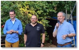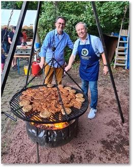 Anschließend löste Herr Minister Jost sein Versprechen aus 2022 ein und begann damit, die zahlreichen Helfer zu verköstigen. Dabei wurde er tatkräftig durch unseren Bürgermeister am Schwenker unterstützt während Markus Weber den Dienst am Zapfhahn übernahm.