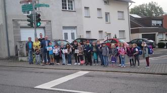 Grundschüler der Laurentiusschule Hülzweiler an der Laufbus Haltestelle “Ecke Irisweg/Rosenstraße“ mit Busfahrer Bürgermeister Hans-Joachim Neumeyer an der Spitze und der stellv. Ortsvorsteherin des Gemeindebezirkes Hülzweiler, Dana Wernet