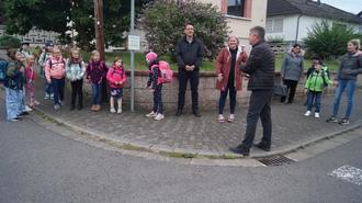 Neben Bürgermeister Markus Weber (links) war auch Ortsvorsteher Sascha Hoen (3.v.r.) beim Startschuss der Kampagne Laufbus in Hülzweiler an der Haltestelle Rosenstr./Irisweg dabei