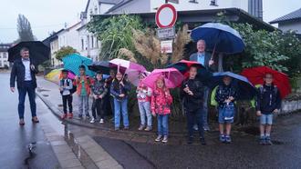 Bürgermeister Markus Weber (4.v.r.) begrüßt Grundschüler der Bachtalschule an der Laufbushaltestelle Kreppgartenstr./Ecke Gatterstr.