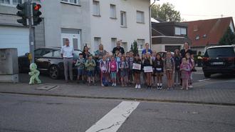 Bürgermeister Markus Weber (links) begrüßte mit der Schulleiterin der Kirchbergschule Andrea Rupp (7.v.l.), den Vorsitzenden von Elternvertretung und Förderverein Sebastian Müller (12.v.l.)und Alexandra Port (rechts) zum Projektstart eine Laubus-Gruppe am Fußgängerüberweg Hauptstr. Ecke Leschweg