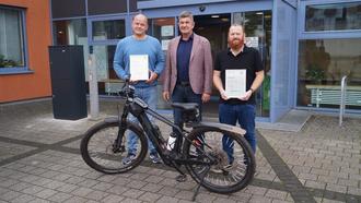 Bürgermeister Markus Weber (2.v.l.) überreicht Frank Bonner (3.v.l.) und Dirk Weber (links) für die Leistungen bei der Aktion STADTRADELN 2024 die Urkunden mit Gold-Auszeichnung.