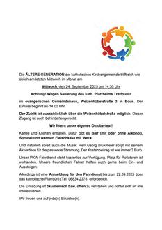 Anmeldung bitte bis 25. September bei Pfarrerin Juliane Opiolla unter juliane.opiolla@ekir.de oder 0176 53 53 92 98.