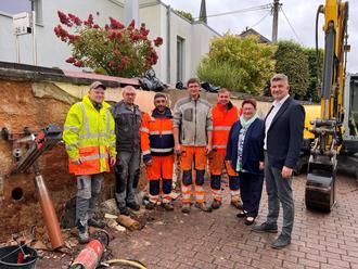 v.l.n.r.: Die Arbeiter der zuständigen Baufirma aventas.bau mit ihrem Polier Sebastian Später (5.v.l.), Ortsvorsteherin Christel Albert und Bürgermeister Markus Weber auf der Baustelle