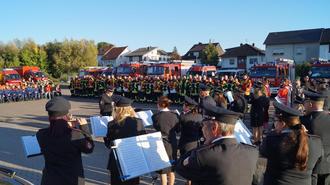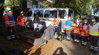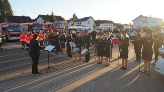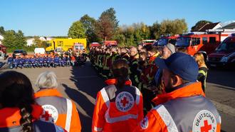 Im Anschluss an die erfolgreiche Übung traten Freiwillige Feuerwehr und das Deutsche Rote Kreuz unter den Klängen des Tambour Corps vor dem Feuerwehrgerätehaus in Hülzweiler zur Meldung an Bürgermeister Hans-Joachim Neumeyer, Wehrführer Torsten Kaspar und Wehrführer der Gemeinde Bous Rainer Wolf in Vertretung des Kreisbandinspekteurs an. Neumeyer begrüßte die Anwesenden und dankte den Rettungskräften für ihr Engagement und die gute Zusammenarbeit bei der miterlebten Übung.