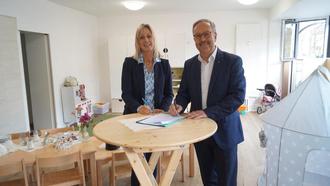 (Bürgermeister Hans-Joachim Neumeyer (re.) und die Geschäftsführerin der KEB-Dillingen, Stefanie Oberbillig (li.), bei der Unterzeichnung des Kooperationsvertrages zwischen der Gemeinde und der KEB (Meine Lebensräume gGmbH) in den neuen Räumlichkeiten der Großtagespflegestelle „Schwalbennest“)