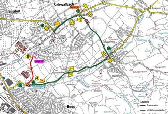 Die Umleitung führt den Verkehr entlang der L 344 (Hauptstraße), L 341 (Elmer Straße / Am Alten Schacht), L 140 (Bachtalstraße) über Schwalbach und Knausholz an der Papiermühle entlang zurück nach Bous. Die Gegenrichtung verläuft entsprechend umgekehrt.