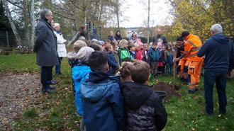 „Der Herbst, der Herbst, der Herbst ist da…“, mit diesem Lied startete bei trockenem Wetter die mittlerweile 46. Baumpflanzaktion an der Bachtal-, Laurentius- und Kirchbergschule.
