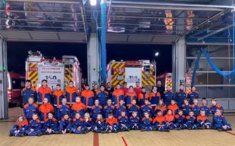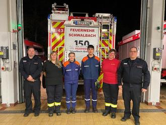 v.l.n.r. Stellvertretender Wehrführer Kevin Weiland, Oberlöschmeisterin Corinna Weiland, Gemeindejugendgruppensprecherin Emily Weiland, Stellvertretender Gemeindejugendgruppensprecher Kilian Hamza, Hauptlöschmeisterin Michelle Eichhorn, Wehrführer Torsten Kaspar