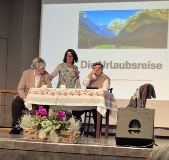 Der Elisabethenchor stimmte unter Leitung von Frau Sandra Becker musikalisch auf den Nachmittag ein. Dann hatten die Besucher/innen die Qual der Wahl am leckeren Kuchenbuffet und der gemütliche Kaffeeplausch begann. Nach einer Ansprache von Herrn Pfarrer Hans-Georg Müller amüsierte sich das Publikum bei dem Sketch „Die Urlaubsreise“. Drei Ehemännern gelang es trickreich, im gleichen Hotel Urlaub zu buchen – somit war der Skatabend gesichert. Es spielten: Alexandra Schmitt, Christel Schorn und Isabell Preß.