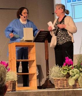 Im Sketch „Die Wechseljahre“ mussten zwei Freundinnen (Gertrud Feld und Doris Graf) zahlreiche schriftliche Fragen beantworten, da sie gemeinsam eine Kur antreten wollten. Es durfte herzlichst gelacht werden. Danach hörte das Publikum in „Die Mandel-OP“, was alles abgeklärt werden muss und welche Kosten entstehen, wenn ein Krankenhausaufenthalt notwendig ist. Dieser Sketch wurde humorvoll und gekonnt umgesetzt von Yvonne Teusch und Helene Altmayer. Sie wurden mit großem Applaus belohnt.