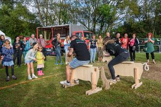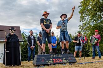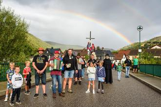 Der Nachmittag des Sonntags stand ganz im Zeichen der Familien, mit Hüpfburg, Bastelstraße, Spielstraße sowie dem traditionellen Preiskegeln für die Großen. Mit einem perfekten Wurf siegte in diesem Jahr Claudia Großmann und gewann den Mächer Korb. Den zweiten Platz belegte Daniel Treuner, der sich nun zu Weihnachten auf eine Ente freuen darf. Markus Heunemann erreichte den dritten Platz und wird mit dem gewonnenen Fass Bier sicherlich etwas anzufangen wissen - Glückwunsch an alle Gewinner! Für musikalische Begleitung sorgten die Waldspitzbuben am Nachmittag und Dmützen am Abend. Leider musste der Auftritt von Dmützen aufgrund von starkem Regen vorzeitig abgebrochen werden, doch die gute Laune blieb davon ungetrübt. Verabschiedet wurde die Eichichter Kirmse am Montagnachmittag mit einem gelungenen musikalischen Ausklang durch Saitenwusel, der noch einmal für jeden Geschmack etwas zu bieten hatte. Trotz weiterhin mäßigem Wetter zog der traditionelle Umzug durchs Dorf, wobei ein unerwarteter doppelter Regenbogen über Eichicht die Gesellschaft in Staunen versetzte und auf Glück auch im kommenden Jahr hoffen lässt.