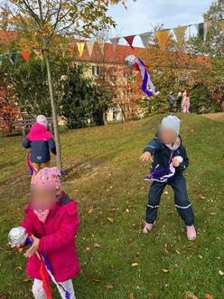 Gemeinsam feierten wir unser Herbstfest mit Blätterdruck, verschiedenen Tupf- und Maltechniken rund um den Herbst, tanzen zu Herbstliedern und betätigten uns sportlich im Garten: hier konnten sich die Kinder im Kastanienweitwurf und Teamspielen messen. Die Mohnblumen bastelten aus Zeitungspapier und bunten Streifen Wurfbälle, welche sich herrlich im Wind bewegen.