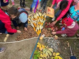 Zum Abschluss gestalteten alle Gruppen gemeinsam ein tolles Herbstmandala im Garten. Hierfür sammelten alle Kinder im Voraus fleißig bunte Blätter, Hagebutten, Nüsse, Äpfel und allerlei andere herbstliche Fundstücke. Den ganzen Oktober und November beschäftigten sich die einzelnen Bereiche mit Projekten zu den Themen Tiere, Pflanzen und Früchte des Herbstes.