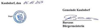 Die Stellungnahme der Rechtsaufsichtsbehörde zur 1. Nachtragshaushaltssatzung 2024 wurde mit Schreiben vom 03.12.2024 (eingegangen am 05.12.2024) der Gemeinde Kaulsdorf übergeben. Die 1.Nachtragshaushaltssatzung enthält keine genehmigungspflichtigen Bestandteile und kann nach § 21 Abs. 3 Satz 3 ThürKO im Amtsblatt der Gemeinde Kaulsdorf -Gemeindenachrichten- bekannt gemacht werden.