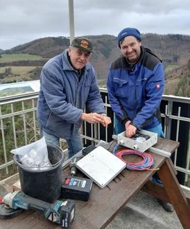 Jürgen Franke beobachtet Andreas Barczus bei der Installation auf dem Turm.