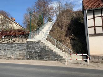 Die alte Treppenanlage aus Betonblockstufen sowie der weiterführende Gehweg und das Geländer waren stark beschädigt und entsprachen nicht mehr den heutigen Vorschriften. Aus diesem Grund wurde die Treppenanlage mit Fördermitteln der Dorferneuerung vollständig erneuert. Bis auf wenige Restarbeiten ist die Treppenanlage fertig gestellt und konnte am 17.03.2023 freigegeben werden.