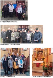 Am Palmsonntag, eine Woche vor Ostern, haben an die 40 Jubelkonfirmanden ihr goldenes, diamantenes und eisernes Konfirmationsjubiläum gefeiert. In dem Festgottesdienst mit den Kirchenchören Kaulsdorf und Eichicht wurde an die Jahre ihrer Konfirmation erinnert, ihrer Paten und Eltern gedacht sowie an die bereits Verstorbenen aus den Konfirmationsjahrgängen. Alle Jubelkonfirmanden sind nochmals eingesegnet worden und haben den Segen Gottes zugesprochen bekommen. Es war ein festlicher Tag, der nach dem Gottesdienst im Gasthaus fortgesetzt wurde und hoffentlich allen in guter Erinnerung bleibt.