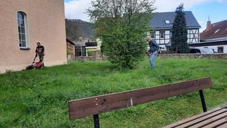 Eine Gruppe, ich nenne sie Kirchmähbrigade, um Jürgen Franke, der auch der sehr aktive Vorsitzende vom Verein „Freunde des Lohmturms Eichicht“ ist, kümmert sich seit nunmehr 34 Jahren um den Platz Rund um die Eichichter Kirche.