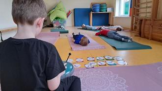 Eine Kinderyoga-Stunde beginnt oft mit einer kurzen Begrüßung und Atemübungen. Danach folgen Bewegungsspiele oder einfache Asanas, die oft mit Tier- oder Naturbegriffen verknüpft sind - etwa die "Baum"-Pose oder der "herabschauende Hund". Zum Abschluss gibt es meist eine Entspannungsphase, bei der die Kinder in eine Traumreise eintauchen oder einfach still liegen dürfen. Die Kinder genossen besonders das sich aktive Miteinbringen durch zum Beispiel Spielen der Zungentrommel oder Klingen der Koshi-Box (Klangspiel) beim Umhergehen.