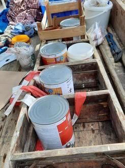 Der Inhalt dieser Dosen und noch mehr, musste am Turm verstrichen werden