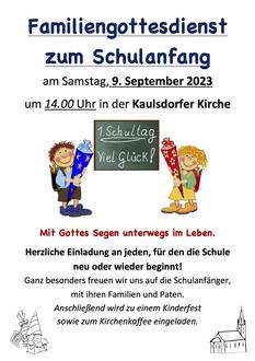 | 14.00 Uhr | Familiengottesdienst zur Schuleinführung mit anschließendem Kinderfest und Kirchenkaffee; Pastorin Winter |