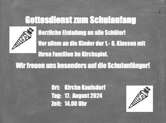 | 14.00 Uhr | Kirche Kaulsdorf, Schulanfängergottesdienst; |