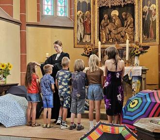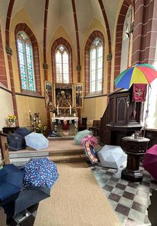 Gottes Segen ist für uns alle wie ein großer Schirm, unter dem wir alle Platz haben. Um dies zu verdeutlichen war die Kaulsdorfer Kirche am 17. August 2024 mit vielen unterschiedlichen Schirmen geschmückt.