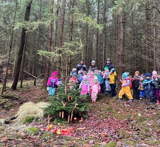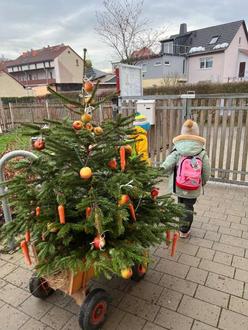 Zu Weihnachten dachten unsere Kinder auch an die Tiere des Waldes. Wie in jedem Jahr haben sie einen wunderschönen Weihnachtsbaum mit Möhren, Äpfeln und Meisenknödeln geschmückt und auf ihrem Bollerwagen in den Wald an die Bibraer Seite am Walpersberg gezogen.