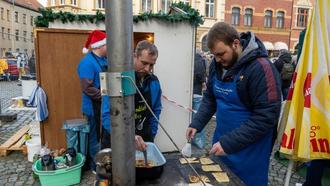 Das Jahr 2025 war geprägt von vielen Aktivitäten des PV Kahla e.V. Den Abschluss im Dezember bildete der Weihnachtsmarkt und die Jahresabschlussfeier der Mitglieder. Am 7. Dezember wurde nun schon traditionell der Infostand auf dem Markt aufgebaut. Auch in diesem Jahr war der Besucherandrang sehr groß am Stand, gab es doch wieder die in Kahla bekannten und beliebten "Detscher".