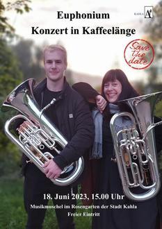 Die Heimatgesellschaft Kahla e.V. präsentiert am Sonntag, den 18. Juni 2023, um 15.00 Uhr in der Musikmuschel im Rosengarten von Kahla ein Euphonium-Konzert, gespielt von der aus Südafrika stammenden Musikerin Andrea Hobson und Jakob Creutzburg. Das Konzert in Kaffeelänge von nur 40 Minuten umfasst alle Arten von Musik von Telemann bis Danny Boy.