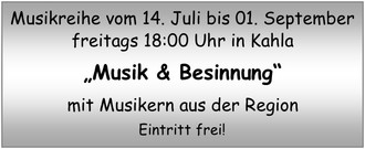| 18:00 Uhr | Kahla, St. Nikolaus: „Musik & Besinnung“ |