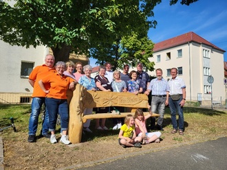 Gemeinsam mit dem Kettensägenkünstler Christian Schmidt aus Rauschwitz wurden Sitzbänke entwickelt. Individuell sind sie gestaltet, mit dem Kastanienblatt und dem Schriftzug Team Straßenfest. Diese wurden dankenswerterweise vom Bauhof Kahla aufgebaut. Eine steht gegenüber der Schule, eine direkt neben der Seniorenresidenz. Erste Fans haben sie bereits.